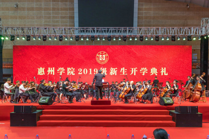 9月11日下午,我院党总支协同惠州学院交响乐团于惠州学院金山湖体育馆举办惠州学院2019级新生开学典礼交响音乐会。此值中华人民共和国成立70周年,惠州学院交响乐团通过“爱国歌曲进校园”的形式,将一首首爱国歌曲精彩演绎,将爱国情、强国志、报国行融入到新生入学教育当中,激发全场师生的爱国热情,推进学校精神文明建设,为祖国华诞献礼。