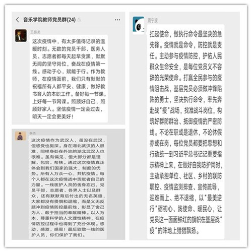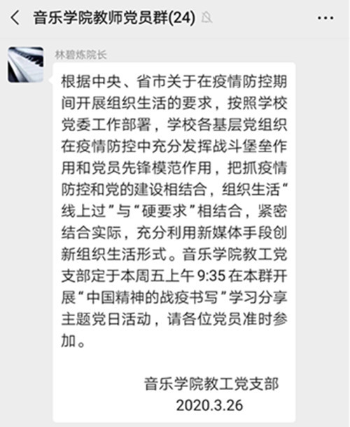 为贯彻学校党委的工作部署,在疫情中充分发挥学院教师党员的战斗堡垒作用和党员先锋模范作用,我院教工党党支部于3月28日上午9:35通过微信群开展“中国精神的战疫书写”学习分享主题党日活动。学院全体教师党员参加本次活动,教工党支部书记林碧炼主持本次会议。