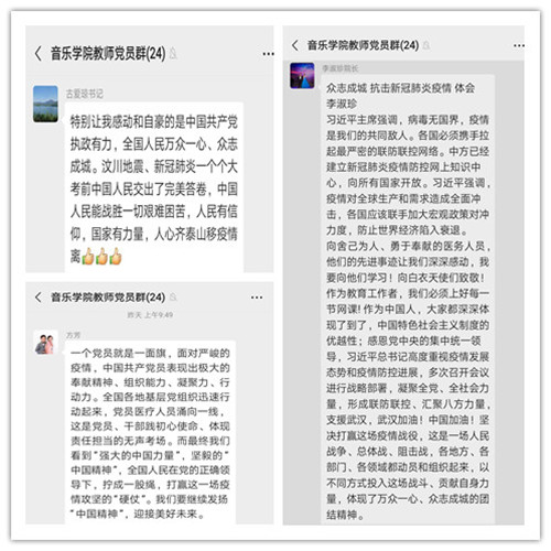 会上,党总支书记岳晓云指出,本次党日活动具有很强的现实意义和长远作用,通过分享交流学习成果的形式,推进建立“学习型”党支部学习机制,激发教师党员学习动力。通过学习“中国精神的战疫书写”,把学习成果转化为坚定的理想信念和自觉行动,充分发挥教师党员的先锋模范作用,落实到教书育人的过程中,以过硬的作风打赢“防疫”战争。随后,各位教师党员积极分享学习体会,战疫过程是彰显中国制度优势的过程,也是彰显中国精神力量的过程,他们感谢、致敬每一位为战疫工作无私奉献的守护者,并提出会注重网课质量,利用课堂做好思想政治教育工作。最后,教工支部书记林碧炼总结本次会议。她指出,相信通过支部主题党日等活动的开展,一定能进一步推进我院教工党员干部思想政治建设,进一步发扬我院教工党员的模范带头作用。