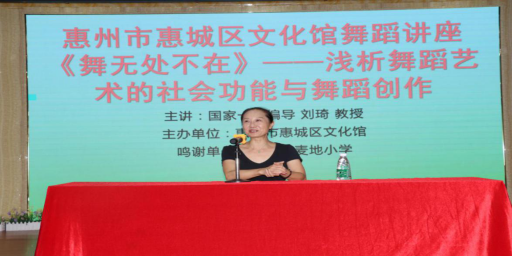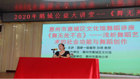 9月21日上午9:00-11:30,国家一级编导、广东现代舞团艺术总监、广东省舞蹈家协会副主席刘琦于惠州市麦地小学开展讲座《舞无处不在》--浅析舞蹈艺术的社会功能与舞蹈。下午14:30-1 7:00开展讲舞堂--动作从哪里来?该课程是“鹅城公益大讲堂”和“讲舞堂”之一,分别由惠州市惠城区文化馆、惠州市惠城区舞蹈家协会主办。音乐学院舞蹈教学部李杰、王健、鹿梦鸽三位教师及2017、2018级全体舞蹈生参加本次课程。