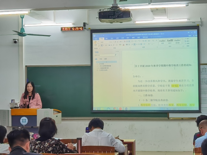 林碧炼副院长布置检查工作,要求各教学部在规定时间内完成自查工作,进一步规范教学秩序,改善教风学风。各班召开班会,让学生了解教风、学风建设的重要性,以及期中教学检查各项工作布置与安排,召开学生座谈会,并对发现的问题进行研判,采取有针对性的解决措施。