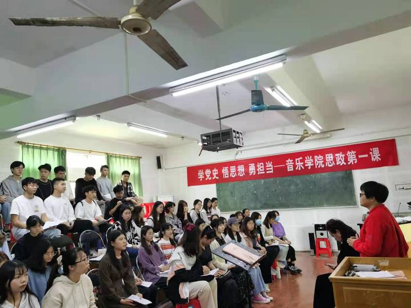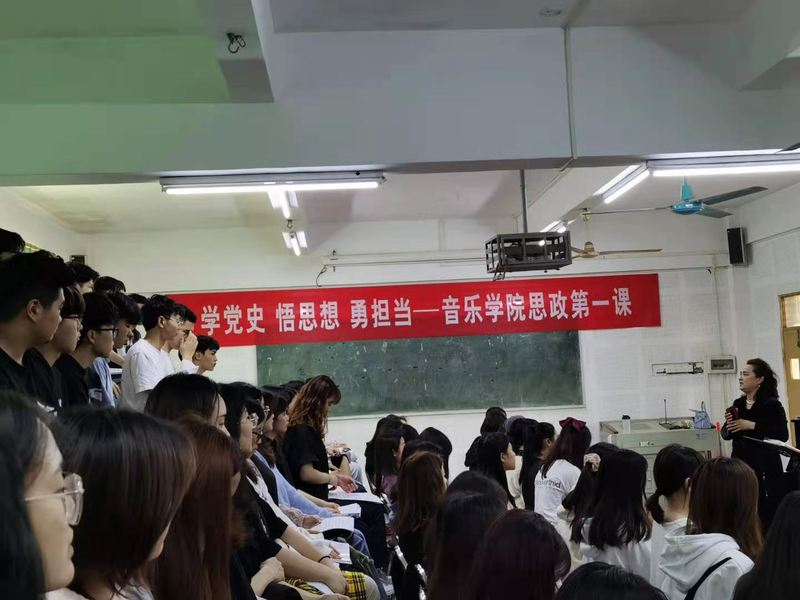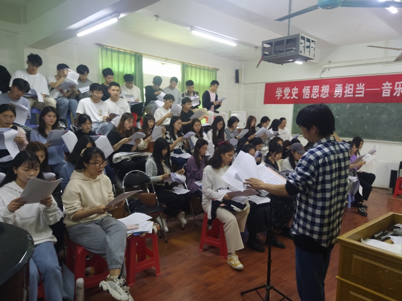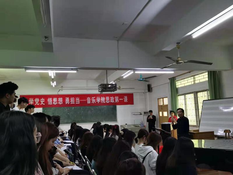 3月11日下午15:00,音乐学院在电子楼二楼合唱课室举行党史学习教育动员暨新学期书记思政第一课,由党总支岳晓云书记主讲,副院长李淑珍、副书记古爱琼、王个松老师、辅导员参加本次会议,合唱团全体同学聆听本次课程。