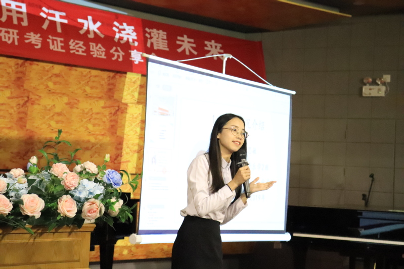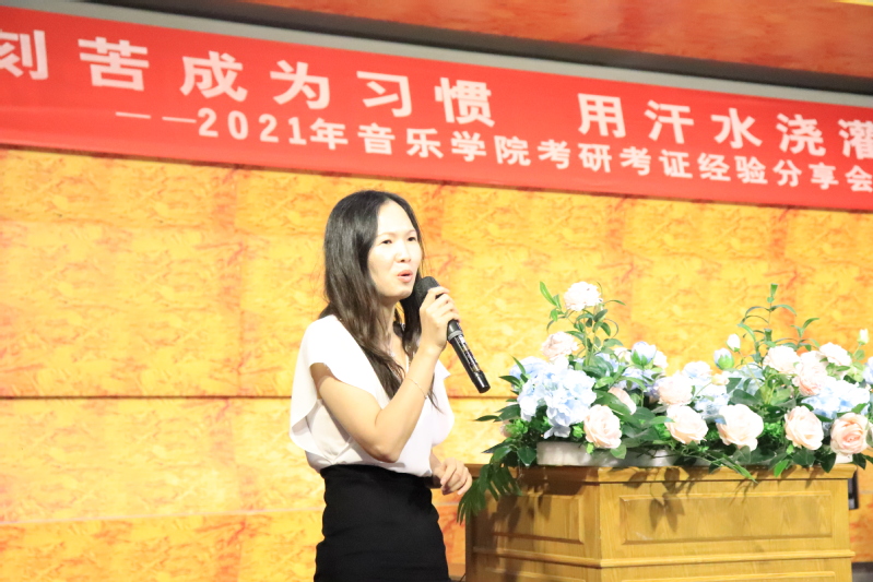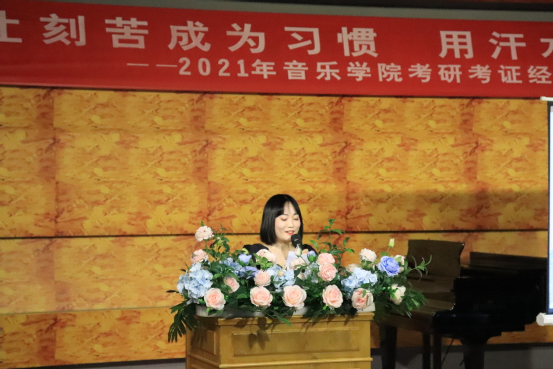 随后,四位成功考研、考证学生代表根据自身的经历作经验分享。17级表演2班唐征帆(现考取西藏大学舞蹈编导专业硕士研究生)从疫情给自己带来的思考,到坚定选择考研和考研路上遇到的困难,考研路上坚持和自律的重要性。17音乐表演2班刘思远(现考取云南民族大学体育瑜伽专业硕士研究生)细心地讲解考研的前期准备以及备考调剂考试的各项要点,讲解了学硕与专硕的不同之处,以及择校的重要性,激励师弟师妹们“越努力越幸运”。17音乐学2班李思敏(通过了高中音乐教师资格证)作了考教师资格证的经验分享,从考试题型、选择备考资料、面试过程中的各种有趣的心理战术,并对报考时间的重要性作了详细的分享。18音乐学2班魏小婷(通过了高中音乐教师资格证)强调考试前期要注重刷课以及总结笔记,考试中期整理思维导图以及背诵考点,考试后期要计时刷题等进行详细的备考经验分享。