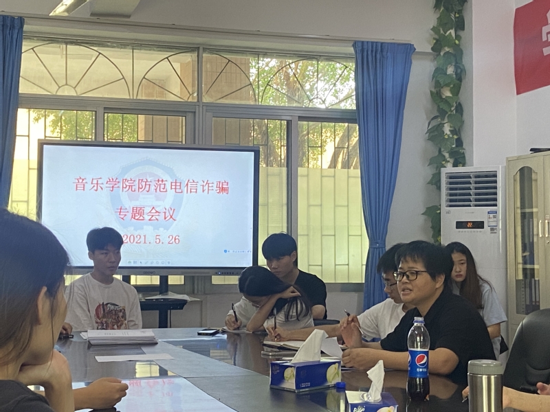 5月26日,我院在音乐学院103会议室召开防范电信诈骗专题会议。学院党总支书记岳晓云、副书记古爱琼、辅导员、各班班长和学习委员参加了本次会议。