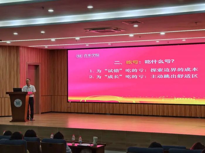 曾裕林书记以“吃苦、吃亏、吃透”三个关键词为主线,结合音乐学习的特殊性,鼓励新生在大学生活中主动历练、勇于担当。学会吃苦:音乐之路没有捷径,唯有苦练才能成就舞台上的光芒;学会吃亏:豁达包容,才能在合作中收获信任与成长;学会吃透:深入钻研,理解音乐背后的文化与情感,才能真正成为有深度的音乐人。他勉励同学们珍惜大学时光,以“三吃”精神锻造过硬本领、涵养高尚品格、奠定专业底蕴。