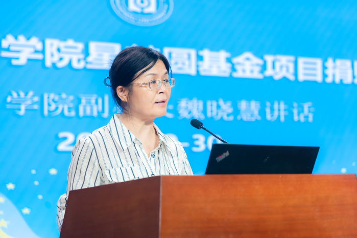 魏晓慧副校长代表学校对广州星梦圆文化艺术有限公司的慷慨善举表示衷心感谢。她指出,校友企业的捐赠不仅体现了企业家反哺教育的责任担当,更是对学校办学实力的认可,为师生树立了感恩与奉献的榜样。魏校长简要介绍了学校近年来在办学层次和产教融合方面取得的新成就,并强调,“星梦圆基金”的注入将为音乐学院的内涵建设注入新的活力,是校企协同、共育人才的良好开端。