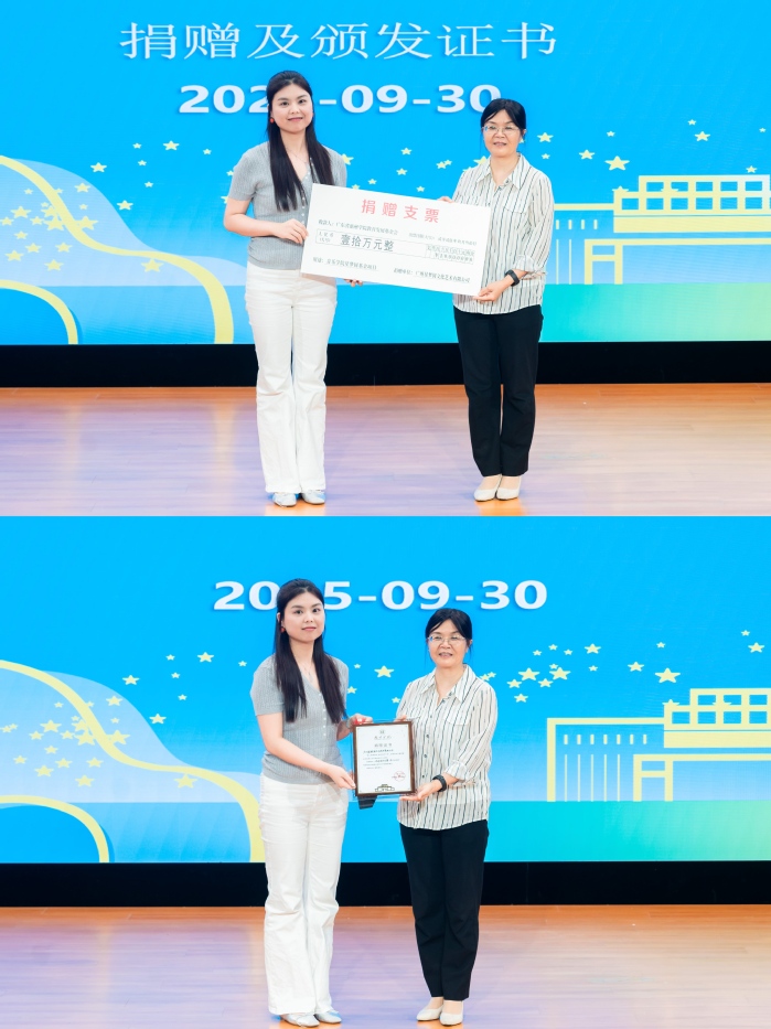 仪式上,惠州学院副校长魏晓慧接受广州星梦圆文化艺术有限公司陈茵总经理的捐赠支票,魏晓慧副校长向陈茵总经理颁发捐赠证书。