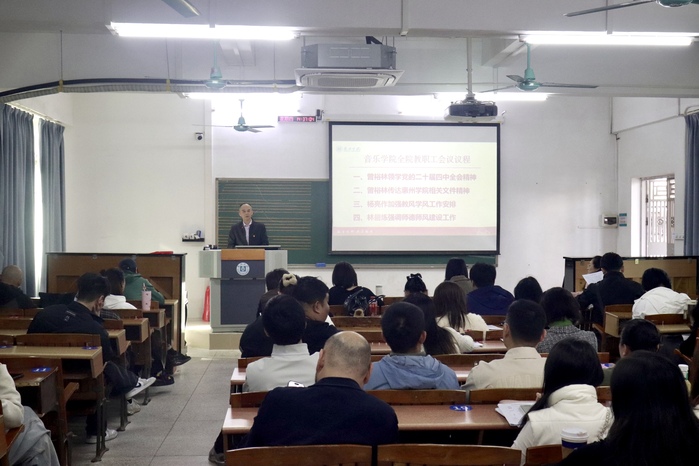 2025年11月27日,为深入学习宣传贯彻党的二十届四中全会精神,音乐学院党委书记曾裕林结合学院办学实际,为学院全体教职工带来了一场深刻且生动的专题学习讲座,旨在将理论学习成果转化为立德树人实效与专业发展动能,以音乐之力践行使命担当。