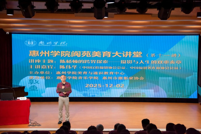 12月2日晚,惠州学院阆苑美育大讲堂第十一讲如期开讲。本次讲座以“陈桥顿的跨界探索——摄影与人生的双重奏章”为主题,由惠州学院音乐学院党委书记曾裕林主持,知名摄影家陈伟华老师担任主讲人。活动由惠州学院美育与通识教育中心主办,惠州学院音乐学院、惠州市摄影家协会联合承办,惠州市摄影家协会主席陈竟辉等嘉宾及音乐学院等150多名师生、摄影爱好者齐聚现场,共享一场光影与人生交织的美育盛宴。