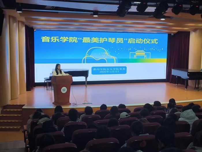 为深入落实立德树人根本任务,将劳动教育与美育、德育深度融合,推动琴房管理规范化与专业化建设,2026年1月8日,惠州学院音乐学院“最美护琴员”启动仪式在音乐楼排演厅隆重举行。学院党委副书记金冶,辅导员黄昌莉、李巧敏及全院学生党员、学生干部代表近200人参加。