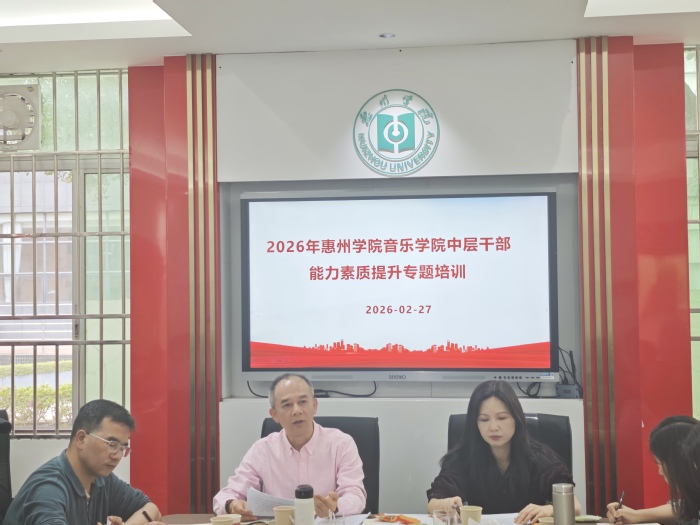 2月27日,音乐学院在音乐楼103会议室举行2026年中层干部能力素质提升专题培训。学院全体中层干部及全体行政管理人员参加培训,学院党委书记曾裕林作题为《强能力转作风担使命》的专题辅导报告。
