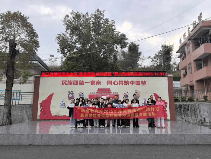 为深入落实广东省教育厅2025年度美育浸润行动计划要求,12月31日,我院赴惠州龙门蓝田民族中学“美育筑梦,跃动蓝田”舞火狗操风采赛。将本土瑶族舞火狗与舞蹈相结合编创的课间操,为校园注入鲜活的美育力量。