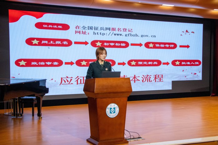 为深入贯彻落实新时代征兵工作要求,切实做好大学生征兵宣传动员工作,引导广大青年学子响应国家号召、投身国防建设,4月15日,我院在音乐楼排演厅开展应征入伍主题宣讲活动。本次活动邀请学校征兵宣讲团成员、退役大学生士兵林杜锋和廖雪利担任宣讲员,以“亲历者讲述+政策解读”的形式,帮助同学们全面了解征兵政策、军营生活与发展机遇。