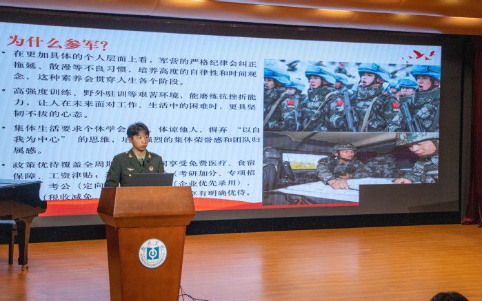 活动伊始,两位宣讲员结合自身经历,分享了两年军旅生涯的难忘故事。林杜锋同学以“初心与成长”为主题,讲述了从体能薄弱的新兵,在班长的严格要求与自身坚持下,实现单杠、三公里等科目从“不及格”到“优秀”的蜕变过程,用“向上爬的过程是痛苦的,只有咬牙坚持才能收获进步”的感悟,传递了军营教会的坚韧与担当。廖雪利同学则分享了作为火箭军通信兵的经历,从光缆抢修百余次的岗位坚守,到担任篮球裁判、参与文艺汇演的文体风采,展现了女兵在军营中兼具专业能力与青春活力的模样,她提到“每一次保障任务、每一次训练考核,都让我更加明白‘责任’二字的重量”。 随后,廖雪利同学又围绕大学生征兵政策展开详细解读,重点介绍了2026年应征报名时间、征集年龄、体检标准等关键信息,并针对惠城区入伍综合素质评定办法进行说明,从文化程度、体能水平等方面解读评分标准,让同学们清晰了解入伍流程与评定要求。同时,他们重点讲解了大学生士兵“四优先”政策,以及学费补偿、升学优惠、退役发展等福利保障,明确参军入伍对个人成长与未来发展的多重利好,打消同学们的顾虑。